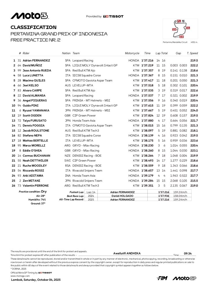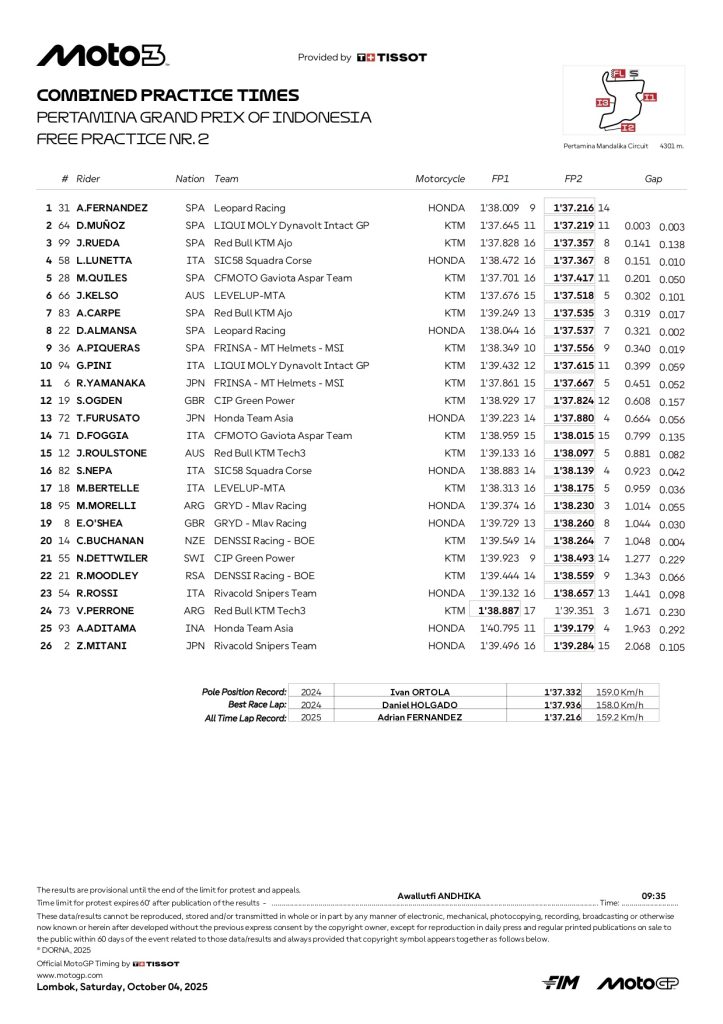 『2025 インドネシアGP モト3 FP2総合リザルト』