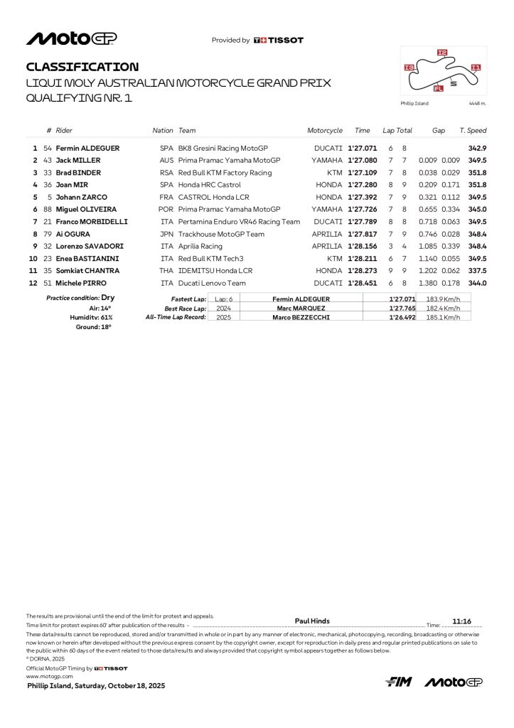 『2025 オーストラリアGP モトGP 予選1リザルト』
