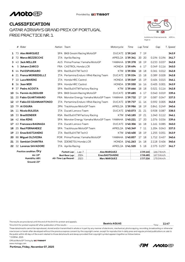 『2025 ポルトガルGP モトGP FP1リザルト』