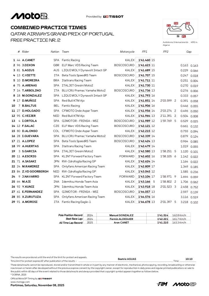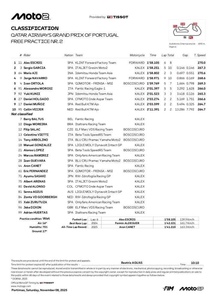 『2025 ポルトガルGP モト2 FP総合リザルト』