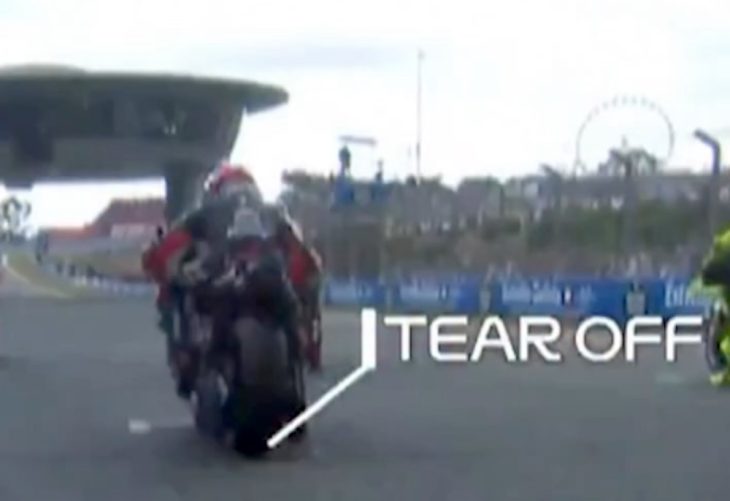 ウォームアップラップの最終コーナー立ち上がりでアレックス・マルケスが捨てたティアオフシールドが、まずはベッツェッキ機のウィングに貼り付き、その後、リアタイヤの下に入り込んでいたのだ。