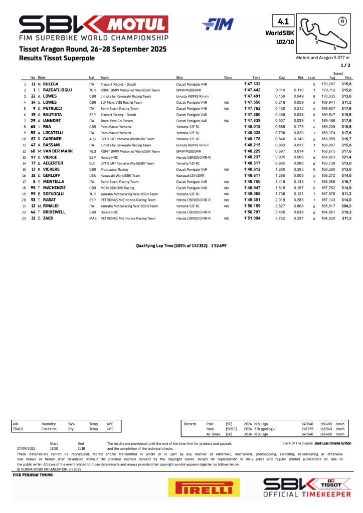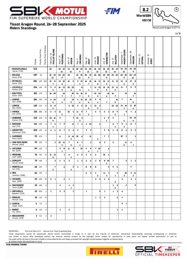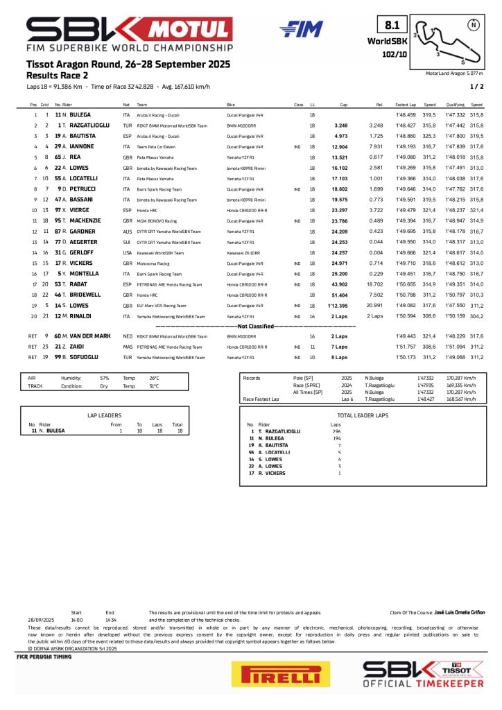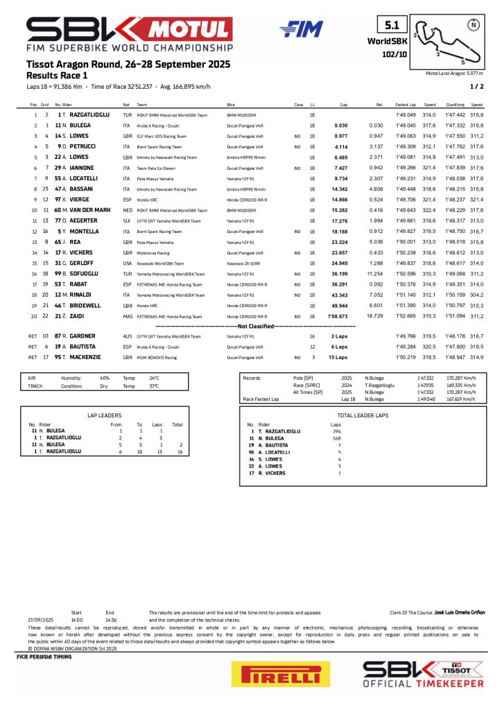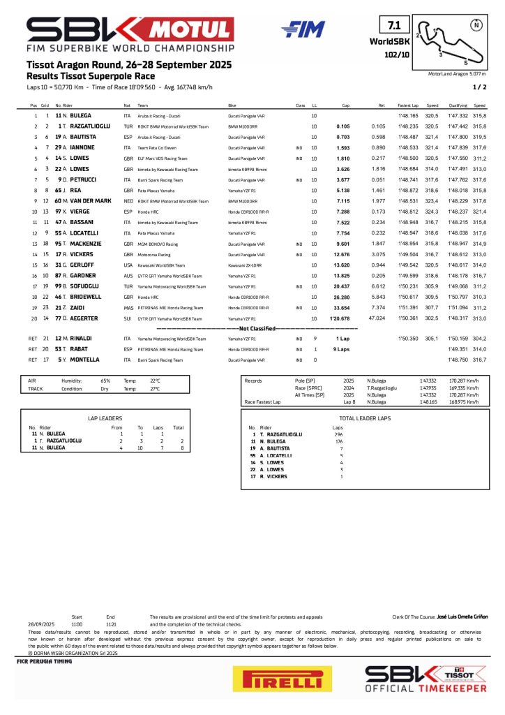 ★9月26〜28日開催のSBKアラゴンラウンドのリザルトは以下のとおり。