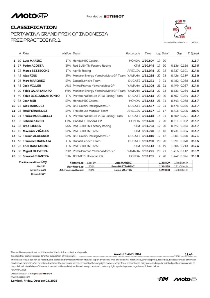 ★10月3日(金)、インドネシアGP モトGPクラスのFP1が行われた。