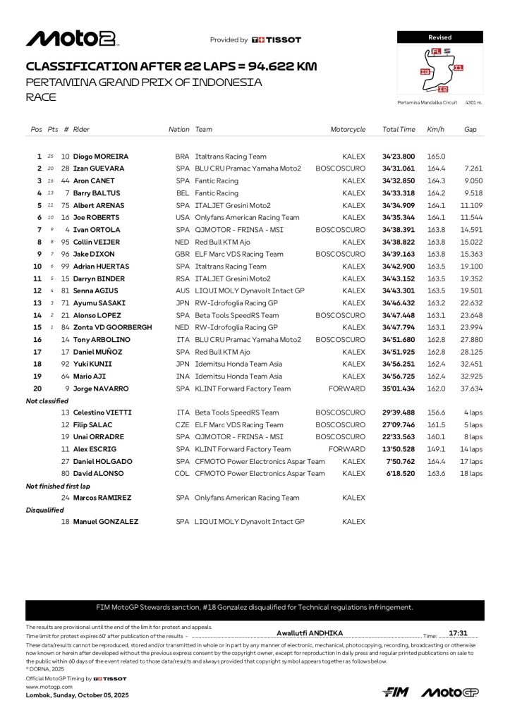 ★インドネシアGP モト2決勝の新リザルトは以下のとおり。