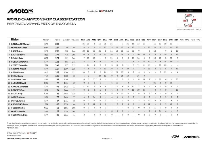 『2025 インドネシアGP モト2 新総合順位』
