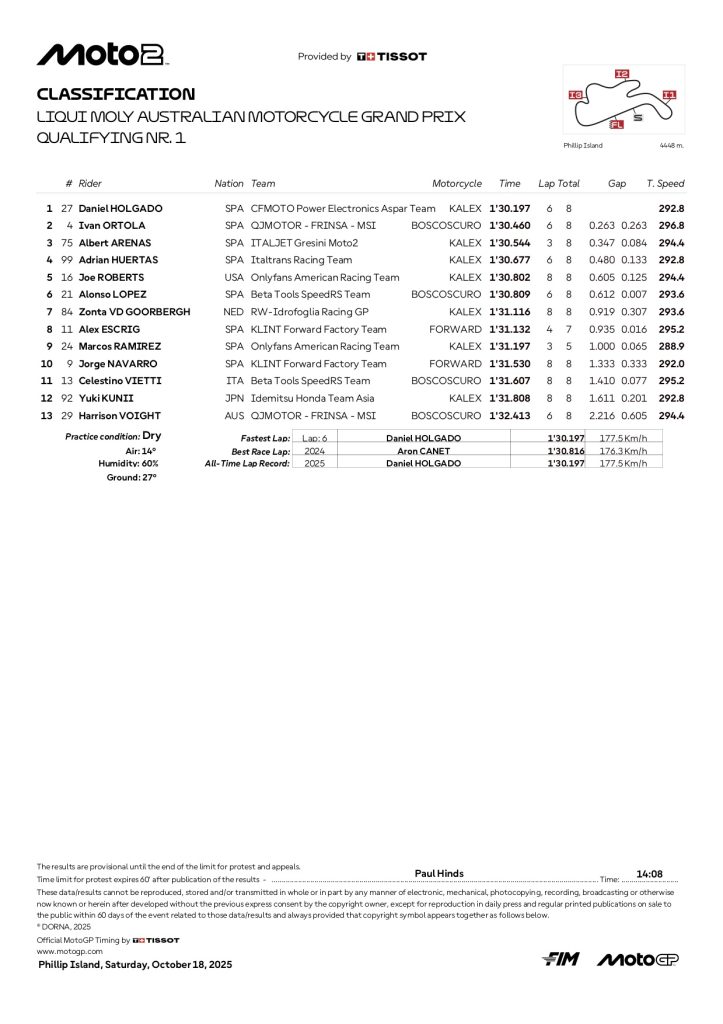 『2025 オーストラリアGP モト2 予選1リザルト』