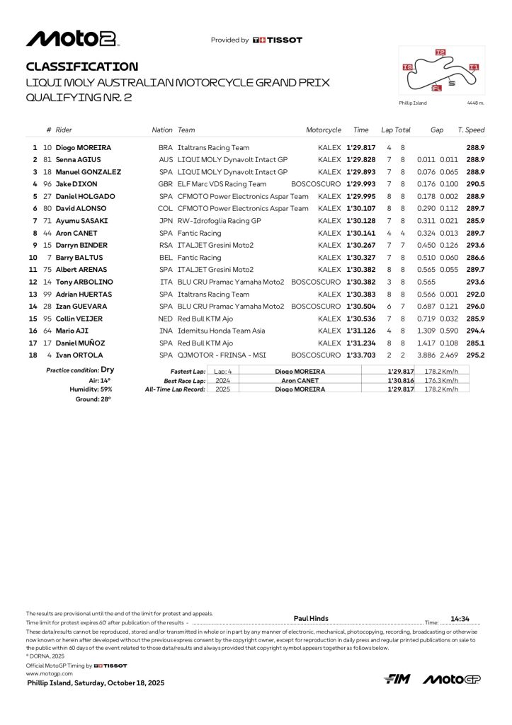 『2025 オーストラリアGP モト2 予選2リザルト』