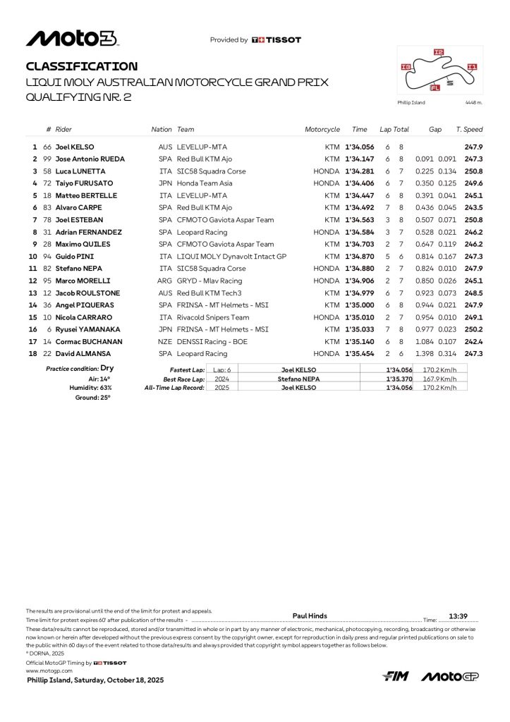 『2025 オーストラリアGP モト3 予選2リザルト』