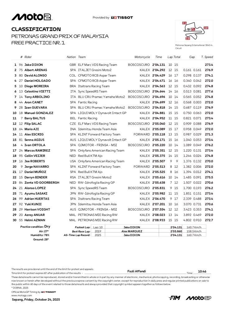 『2025 マレーシアìアGP モト2 FP1リザルト』