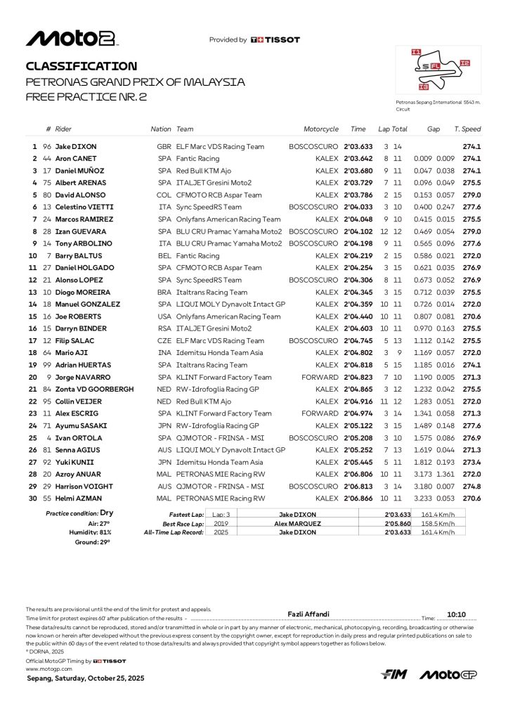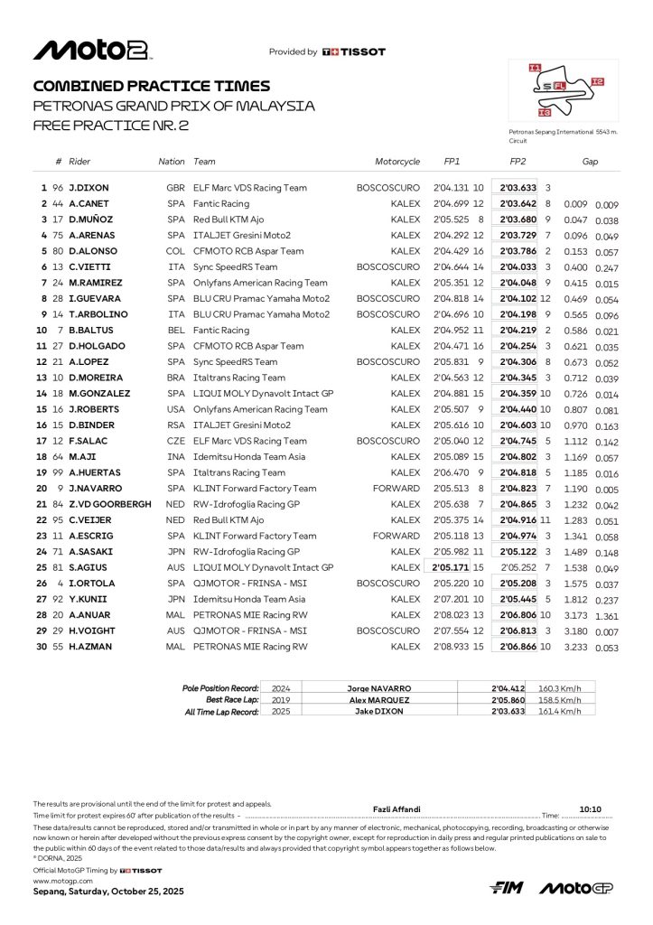 『2025 マレーシアGP モト2 FP2総合リザルト』
