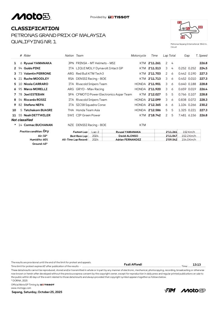 『2025 マレーシアGP モト3 予選1リザルト』