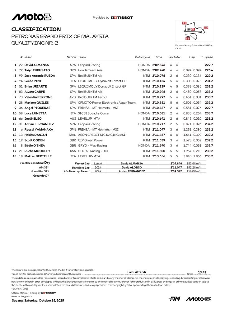 『2025 マレーシアGP モト3 予選2リザルト』