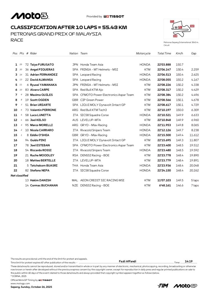 ★10月26日(日)、マレーシアGP モト3クラスの決勝が行われた。
