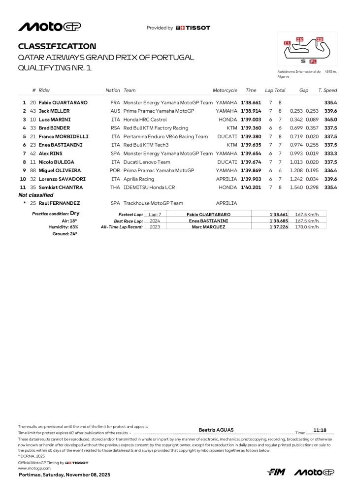『2025 ポルトガルGP モトGP 予選1リザルト』