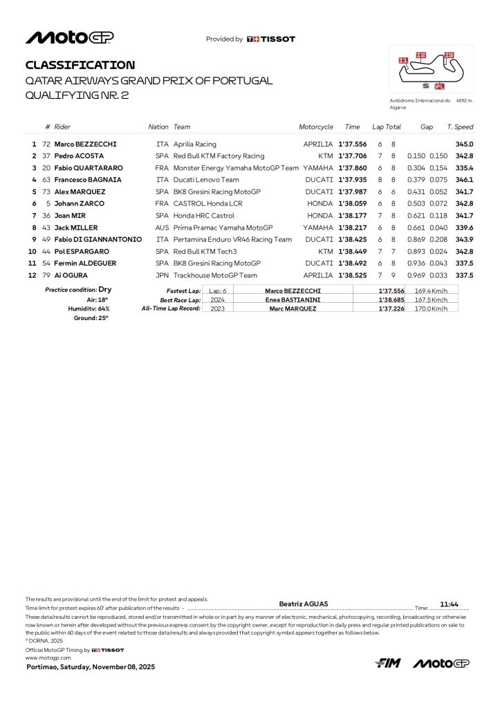 『2025 ポルトガルGP モトGP 予選2リザルト』