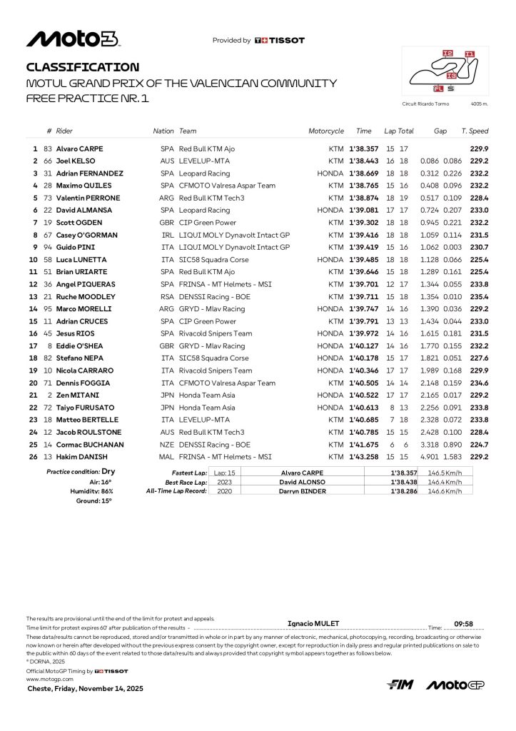 ★11月14日(金)、バレンシアGP モト3クラスのFP1が行われた。