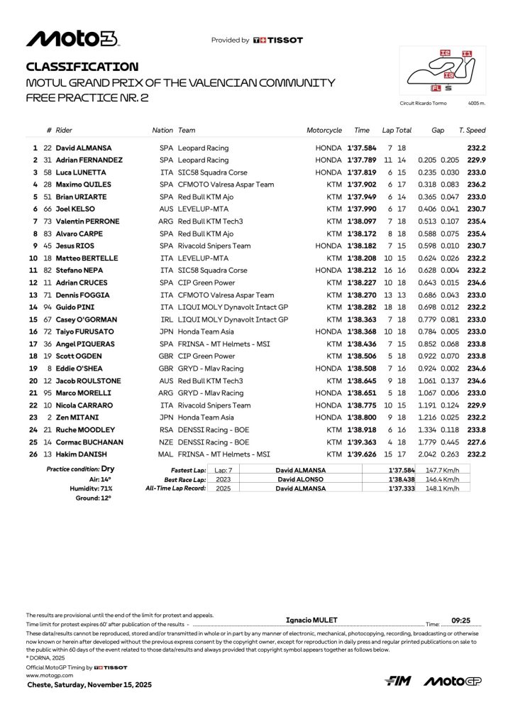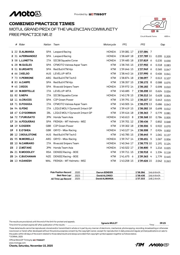 『2025 バレンシアGP モト3 FP総合リザルト』