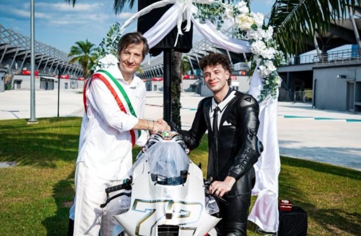 ★発表は『届け出挙式』のようなスタイルで行われ、マッシモ・リヴォラ(アプリリアレーシングCEO)が市長役を務めた(下動画)。