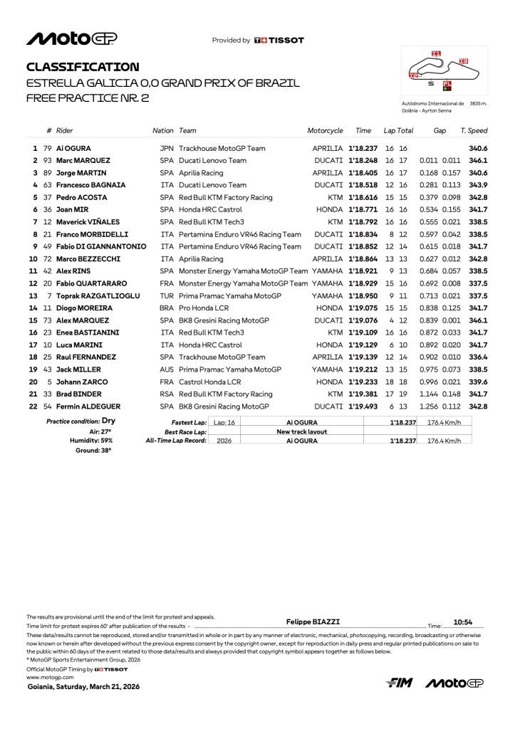 『2026 ブラジルGP モトGP FP2リザルト』