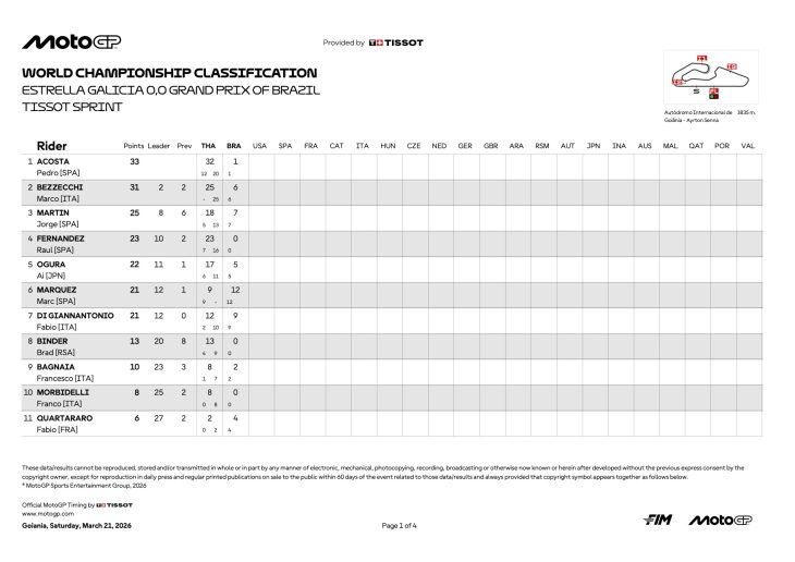 『2026 ブラジルGP モトGP 総合順位』