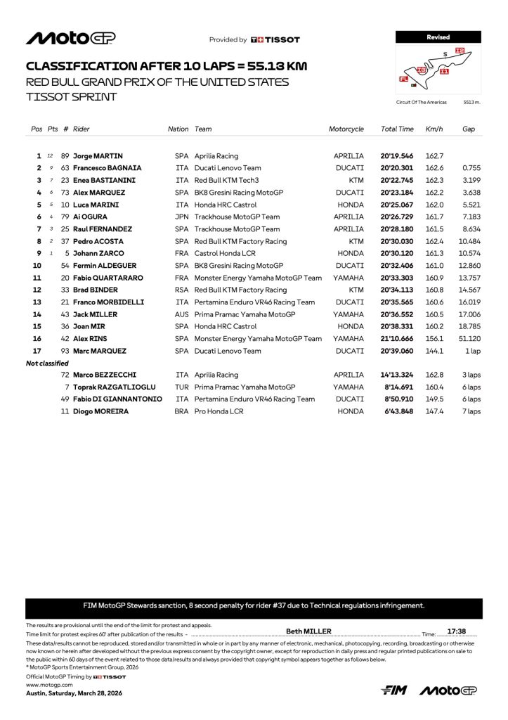 ★スプリント終了後、アコスタ選手はタイヤの空気圧違反により8秒ペナルティが科せられた。これにより同選手は8位に降格し、代わりにエネア・バスティアニーニ(KTMテック3)が3位表彰台となった。