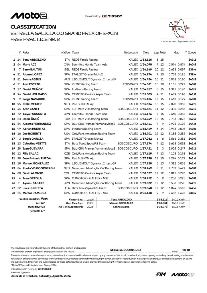 2026スペインGP【モト2:FP2リザルト】