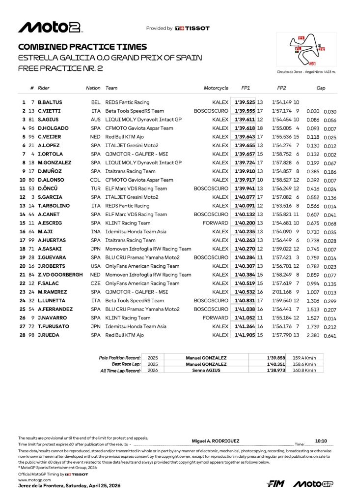 『2026 スペインGP モト2 FP総合リザルト』