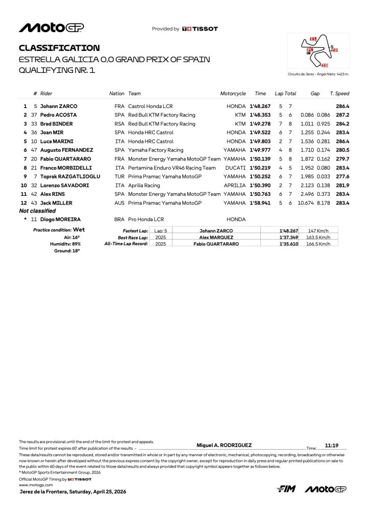 『2026 スペインGP モトGP 予選1リザルト』